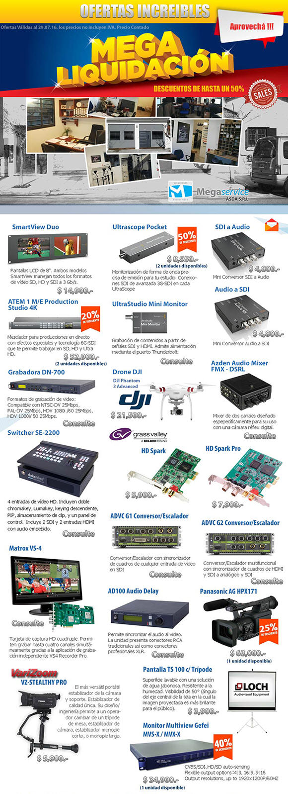 Marcas Representadas Grass Valley............... Datavideo............... Blackmagic............... Matrox............... Teltron............... Stream Labs............... Varizoom............... Frezzi............... Azden............... Telemetrics............... Prolite............... Squid............... Logickeyboard............... Marcas Distribuidas Panasonic.......... Video5.......... Manfrotto.......... Pro-Video.......... Sennheiser.......... Marcas a la Venta Sony.......... Compix..........